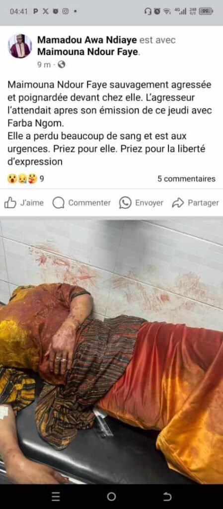 En effet, le collaborateur de Maimouna Ndour Faye, Mamadou Awa Ndiaye de préciser que « l’agresseur l’attendait après son émission de ce jeudi avec Farba Ngom. Elle a perdu beaucoup de sang et est aux urgences. Priez pour elle. Priez pour la liberté d’expression« .