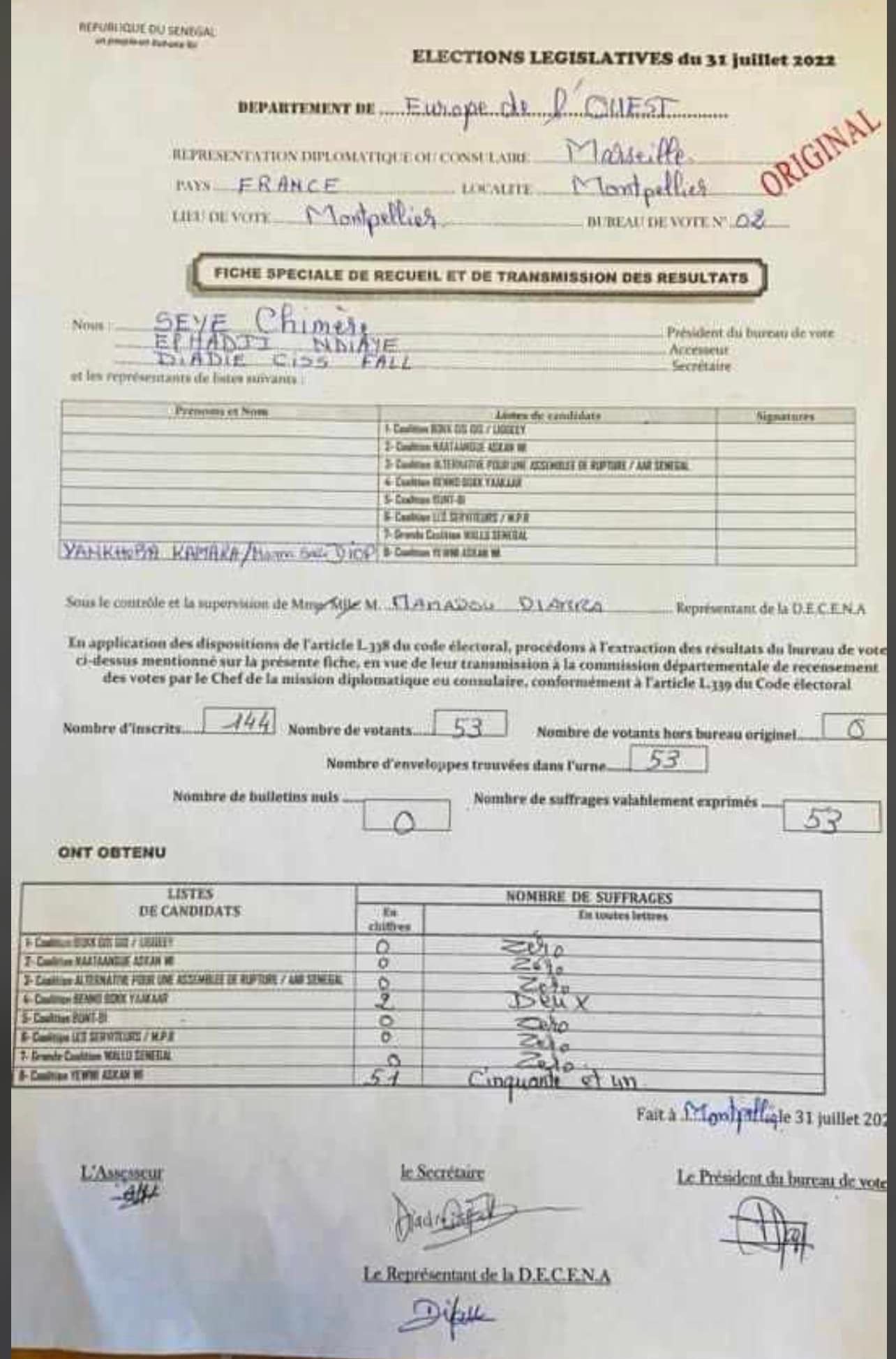 La coalition Yewwi Askan Wi a largement dominé ses adversaires. Sur un nombre de 144 inscrits, le département d’Europe de l’Ouest a enregistré 53 votants. Yewwi a obtenu 51 des suffrages contre 2 pour Benno Bokk Yakar.