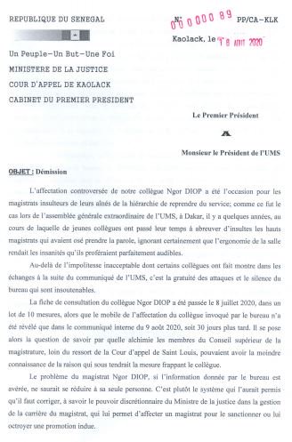 «Le combat pour le changement du système ne sera pas gagné par I’Ums seule, encore moins par des invectives à l’endroit des magistrats de la hiérarchie qui ne sont pas eux-mêmes à l’abri d’abus de ce système dont j’ai été moi-même victime en1994 déjà. Les chefs de la hiérarchie judiciaire, conspués et insultés par des collègues dont ils ont contribué á leur formation, vous seraient d’un apport décisif si les magistrats apprenaient enfin à les respecter. En ce qui me concerne, ne pouvant plus supporter ces insultes, je vous présente ma démission de I’Ums», tonne-t-il avant de réitérer le motif de son départ de l’Union des Magistrats du Sénégal. Il dit : «L’affectation controversée de notre collègue Ngor Diop a été l’occasion pour les magistrats insulteurs de leurs ainés de la hiérarchie de reprendre du service; comme ce fut le cas lors de l’assemblée générale extraordinaire de I’Ums, à Dakar, il y a quelques années, au cours de laquelle de jeunes collègues ont passé leur temps à abreuver d’insultes les hauts magistrats qui avaient osé prendre la parole, ignorant certainement que l’ergonomie de la salle rendait les insanités qu’ils proféraient parfaitement audibles»